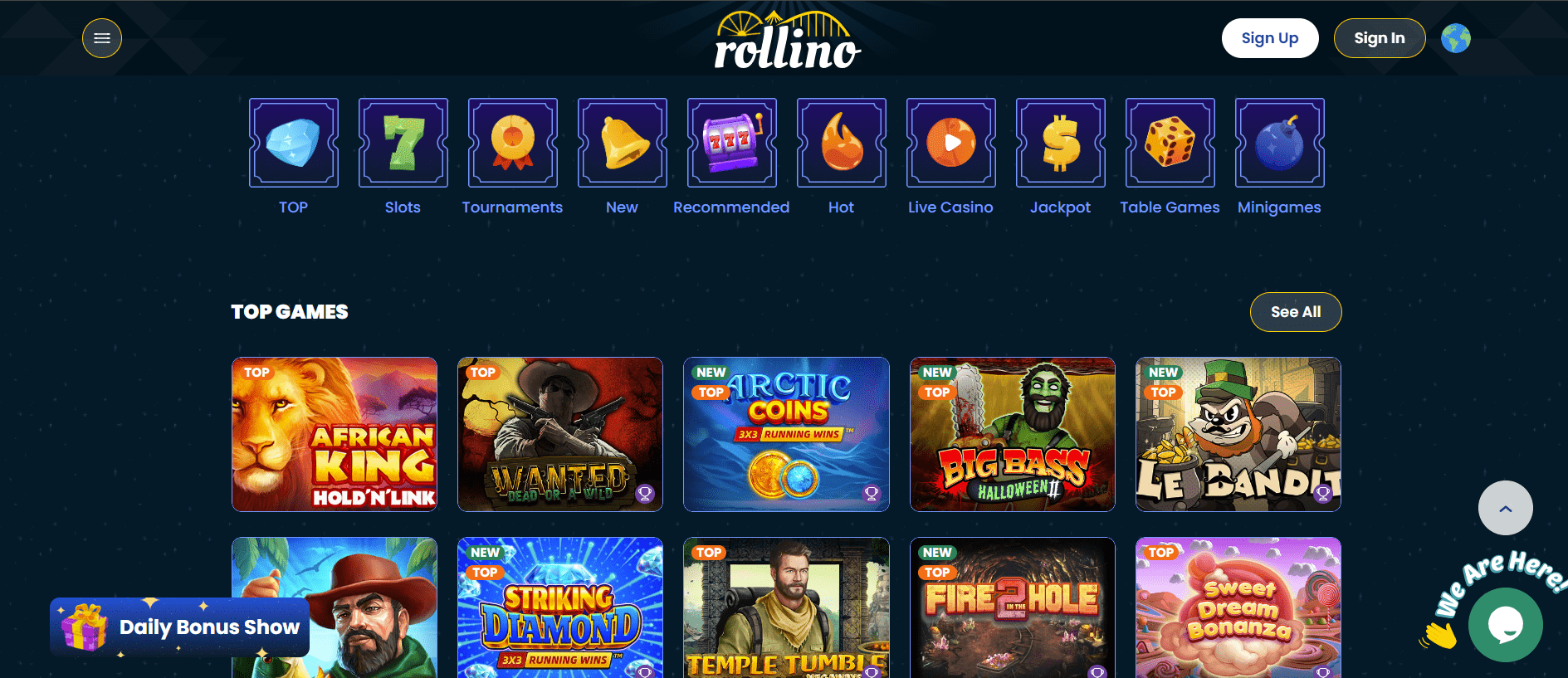 Bei Rollino können Sie zahlreiche Spielaktivitäten mit einer umfangreichen Casino-Spielesammlung mit mehr als 4000 Titeln und einem großen Sportwettenbereich genießen, der Quoten für Tausende von Events bietet. In den Casino-Kategorien gibt es alle Arten von Spielautomaten, mehrere Minispiele und viele virtuelle und Live-Tischspiele. Was das Sportwettenangebot betrifft, können Sie auf Fußball, Basketball, Cricket, Tennis, MMA und viele andere wetten.