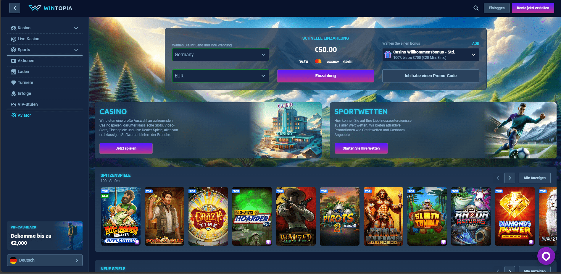 Untersuchen Sie die Spiele, die im Casino immer verfügbar sind. Die verschiedenen Arten von Boni, darunter Einzahlungsboni, Freispiele und wettfreie Boni, sowie die verfügbaren Bankoptionen. Ein weiterer Gesichtspunkt sind die mit den Boni verbundenen Wettanforderungen. Wenn Ihnen gefällt, was Sie sehen, klicken Sie auf die Schaltfläche „Registrieren“ des Casinos, um fortzufahren.