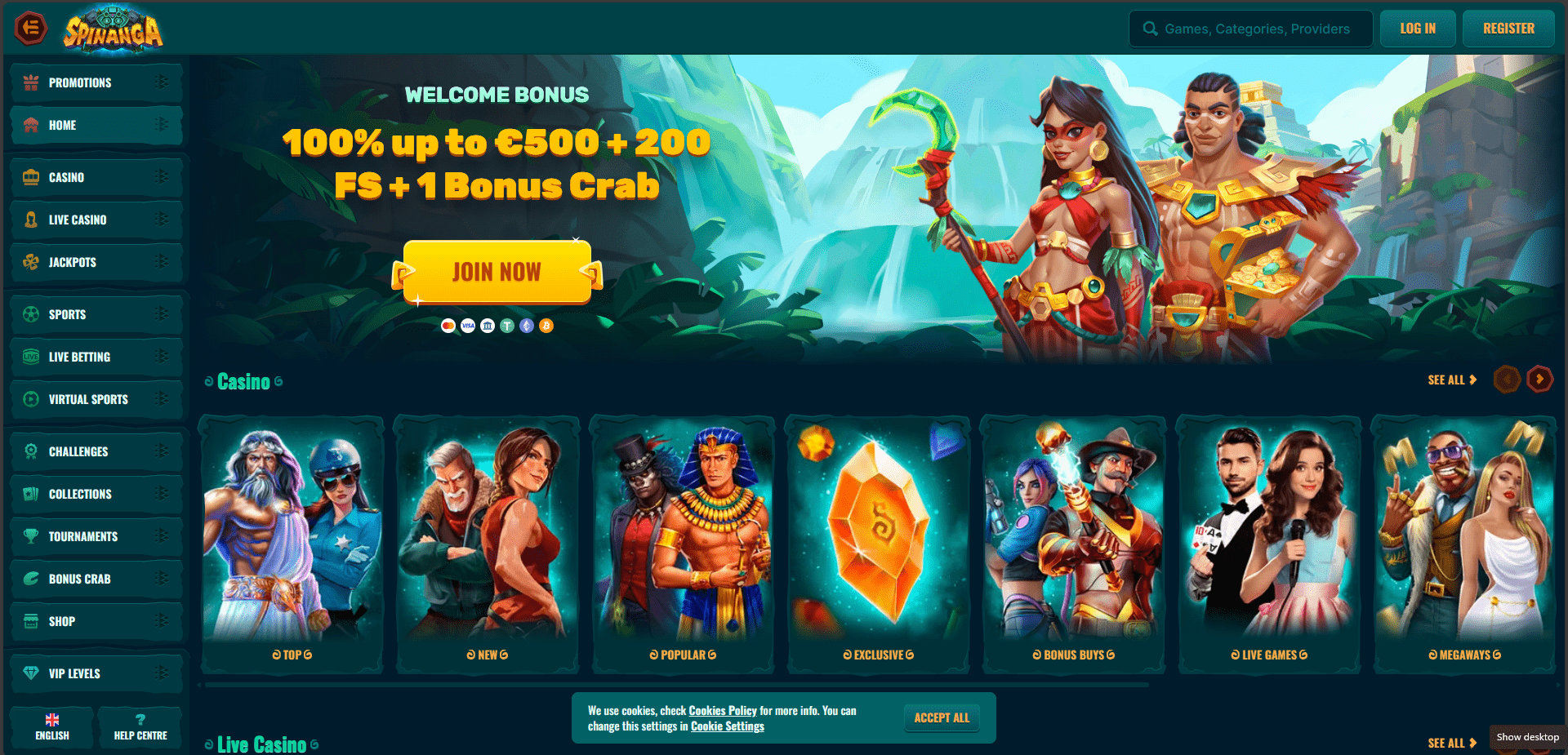 You can use Tether (USDT), Bitcoin (BTC), Litecoin (LTC), Ethereum (ETH), USD Coin (USDC), Binance (BNB), Dogecoin (DOGE), Solana (SOL), Shiba Inu (SHIB), or Tron (TRX). Spinanga Casino is operated by a preferred crypto operator.